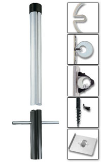 Der Aluminium–Schraubkanalpfosten von FP zeichnet sich durch hohe Stabilität und Anwenderfreundlichkeit aus. Seine Nut, in voller Länge als Schraubkanal ausgelegt, verzahnt sich bei Befestigung von FP-Schild und Halteplatte exakt und sicher mit der 5,5 mm V2A–Schraube. Dabei können FP-Schild und FP–Aluminium-Halteplatten auf jeder Höhe am Schraubkanalpfosten fest angebracht werden.
